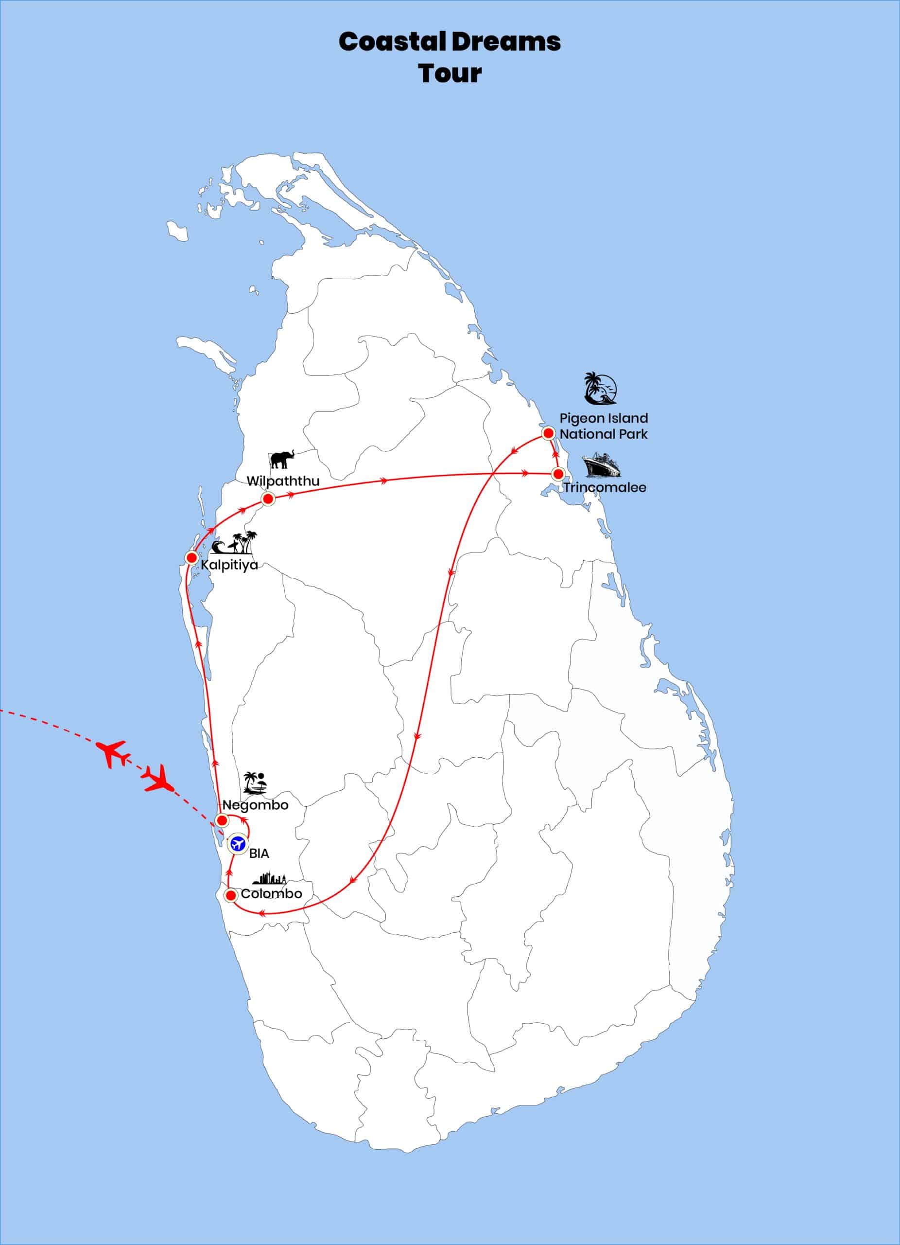 This customizable Sea Lover Tour in Sri Lanka lets you explore top coastal gems like Trincomalee, Negombo, Pasikudah, or the southern coast. Enjoy dolphin & whale watching, Pigeon Island, and serene beaches. We take care of everything—comfortable car with an experienced chauffeur guide, quality hotels with breakfast, free Wi-Fi, A/C, and on-site restaurants—so you can simply relax and enjoy.