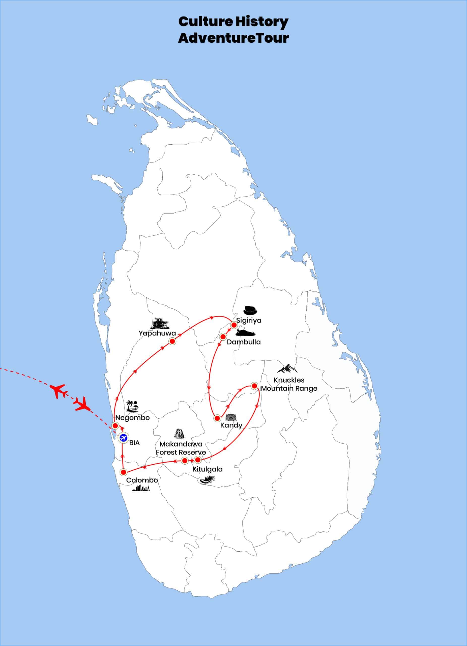 Unforgettable tour to Sri Lanka with challenging activities. We start our journey from Negombo and Sigiriya. After visiting Sigiriya, head into Kandy, surrounded by mountains that are home to tea plantations and biodiverse rainforest. Our next destination will be Knuckles Mountain to enjoy botanical beauty with the backdrop of the Knuckles Range and visit Pitawala Pathana and Small Worlds End. Finally, Kitulgala, located beside the Kelani River, is a perfect destination in Sri Lanka for adventure seekers and nature lovers, particularly those keen on white-water rafting and birdwatching.